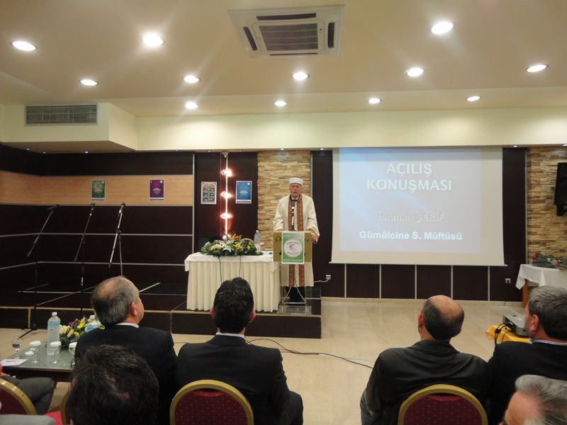 Gümülcine S. Müftüsü İbrahim Şerif yaptığı açılış konuşmasında öncelikle katılan tüm izleyicilere teşekkür etti. Konuşmasında "Sevgili Peygamberimiz'i anmaktan ziyade, anlamaya çalışmak ve onun getirdikleri üzerinde düşünmeye ve düşündükten sonra anlamaya, anladıktan sonra da yaşamaya tüm Mü'minler olarak çaba göstermemiz gerekmektedir. Bu seneki kutlu doğum konusu İnsan Onuru üzerine olduğu için bu gece dinimizin insan onuruna verdiği önem, Peygamberimiz'in hayatından kesitler ile anlatılmaya çalışılacaktır." dedi.