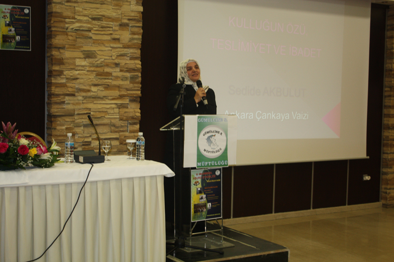 Devamında konuşmacı Sedide Akbulut "Kulluğun Özü, Teslimiyet ve İbadet" başlıklı konuşması ile dinleyenleri mest etti. Konuşmanın ardından ilahiler ve sureler okundu.
