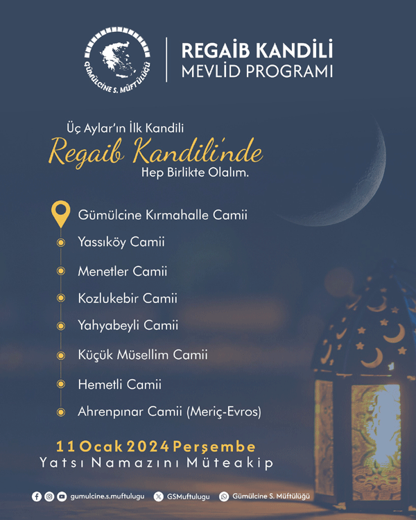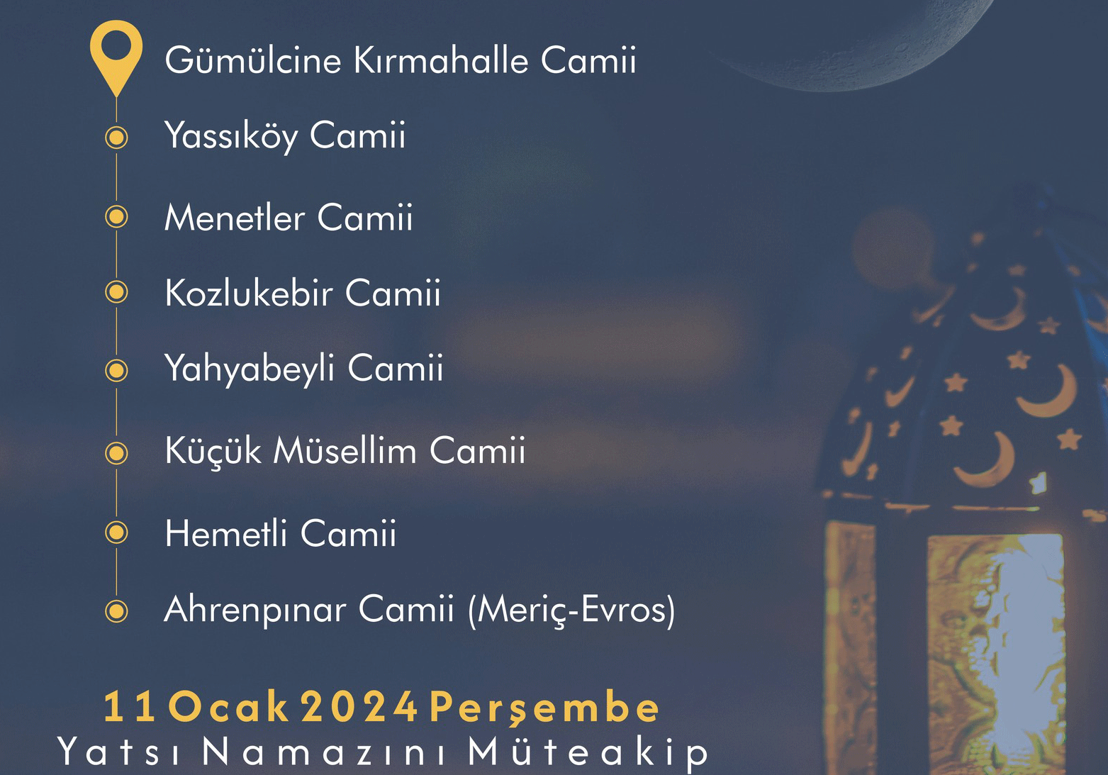 11 Ocak 2024 Perşembe, yatsı namazını müteakip, Yassıköy, Menetler, Kozlukebir, Yahyabeyli, Küçük Müsellim, Hemetli ve Ahrenpınar Camiileri'nde buluşuyoruz...
