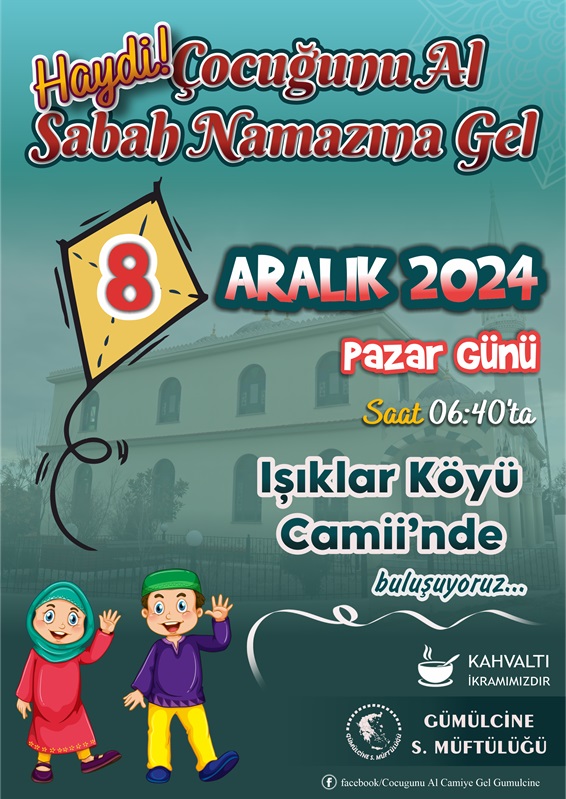 “Çocuğunu Al Sabah Namazına Gel” programı 8 Aralık 2024 Pazar günü Işıklar Köyü Camii'nde gerçekleşecek.